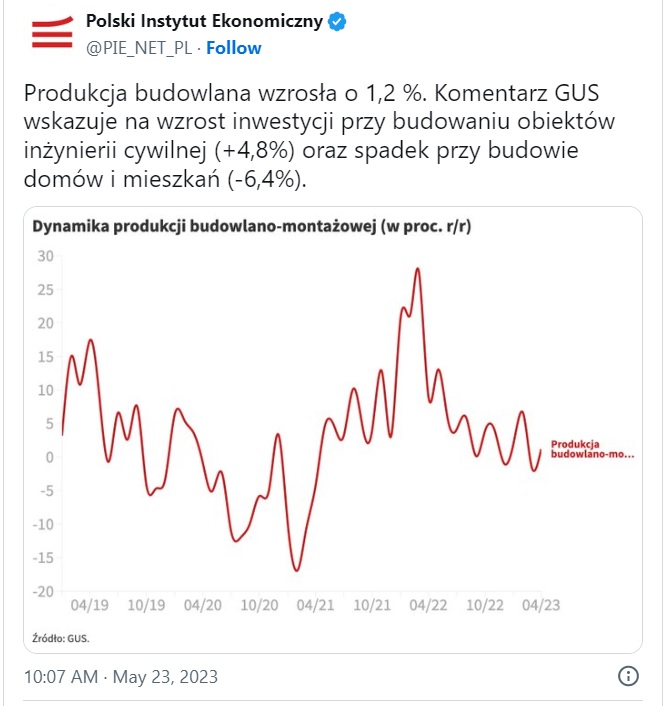 - Produkcji budowlano-montażowej w ujęciu rocznym ciąży spadek budowy budynków (mieszkań), podczas gdy przyspiesza budowa obiektów inżynierii lądowej i wodnej oraz tzw. roboty budowlane specjalistyczne. Można z tego wnioskować, że w obliczu spadającego w ostatnich miesiącach (do mniej więcej lutego - marca br.) zainteresowania zakupem mieszkań przez gospodarstwa domowe, firmy budowlane ograniczały projekty i inwestycje, czego konsekwencje widzimy teraz. Jest jednak nadzieja, że powrót zainteresowania zakupem nieruchomości będzie stopniowo przywracał wzrost budów. Na plusie są inne roboty budowlane, co sugeruje rosnące inwestycje, przede wszystkim infrastrukturalne. Po drugie, w trendzie spadkowym znajdowała się w kwietniu sprzedaż detaliczna towarów. Spadek okazał się trochę mniejszy od prognoz, niemniej jednak jest to nadal skala największa od okresu wybuchu pandemii Covid-19 - wylicza Monika Kurtek.