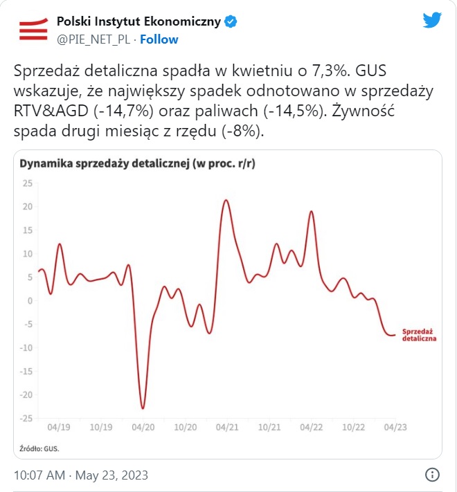 Sprzedaż detaliczna w ujęciu realnym spadła w kwietniu o 7,3 proc. r/r wobec spadku w takiej samej skali w marcu. To odczyt lepszy od oczekiwań. Konsensus prognoz zakładał odczyt na poziomie -8,0 proc. r/r. W ujęciu nominalnym sprzedaż wzrosła o 3,4 proc. r/r wobec wzrostu o 4,8 proc. r/r w poprzednim miesiącu.