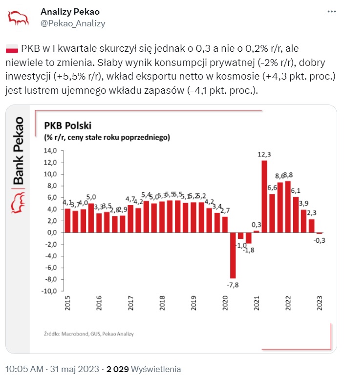 Z danych GUS wynika, że wpływ popytu krajowego na tempo wzrostu gospodarczego w I kw. 2023 r. wyniósł -4,6 pkt proc. (wobec +0,6 pkt w poprzednim kwartale), natomiast wpływ popytu inwestycyjnego sięgnął +0,6 pkt proc. (wobec +1,2 pkt proc.) Wpływ akumulacji brutto na wzrost PKB był negatywny i wyniósł -3,5 pkt proc. (wobec +2,9 pkt proc.). Wpływ eksportu netto był natomiast pozytywny i sięgnął +4,3 pkt proc. (wobec +1,7 pkt proc.).