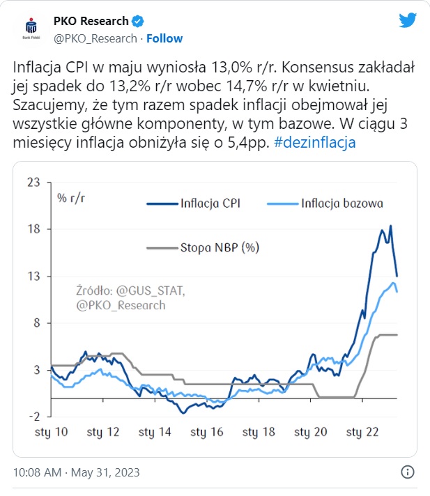 Z szacunków ekonomistów Pekao wynika natomiast, że miara inflacji bazowej spadła do ok. 11,5-11,6 proc. w ujęciu rocznym. - Do tej pory inflacja obniżała się głównie kanałem czynników niebazowych - czyli żywność, energia, paliwa, a majowy odczyt wreszcie pokazuje, że dezinflacja sięgnęła inflacji bazowej. Potwierdza to zakładany przez rynek scenariusz na kolejne miesiące - czyli dalszą dezinflację - wskazują specjaliści Pekao. Ich zdaniem majowy odczyt to sygnał dla gołębi z RPP i wesprze oczekiwania na obniżki jeszcze w tym roku.