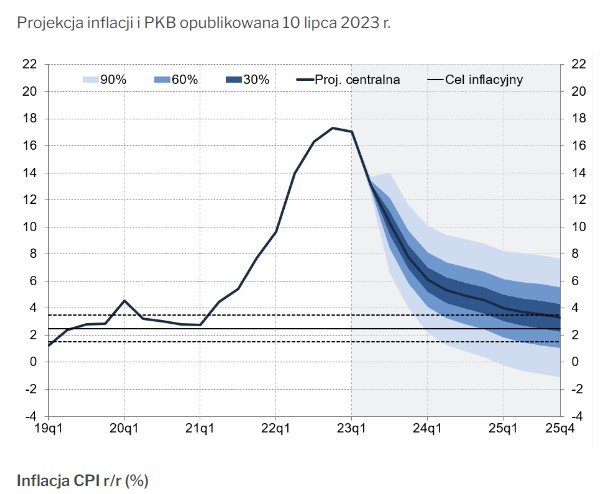 Centralna ścieżka projekcji NBP zakłada, że inflacja CPI w 2023 r. wyniesie 11,9%, w 2024 r. znajdzie się na poziomie 5,2%, a w 2025 r. obniży się do 3,6% - wynika z lipcowej projekcji NBP.