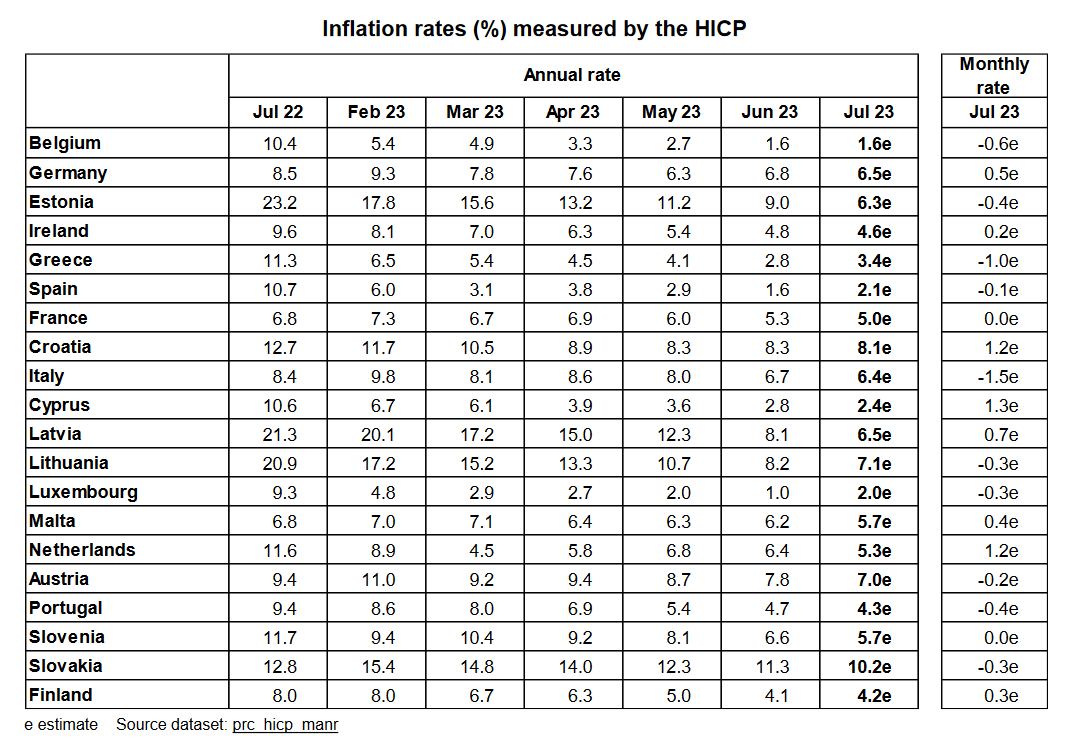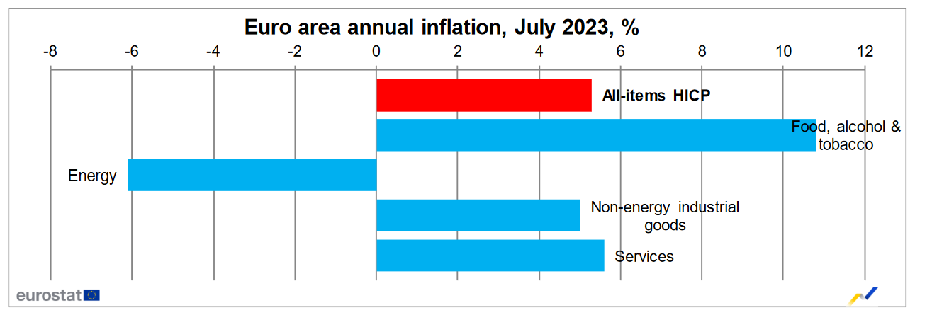 Według wstępnego odczytu Eurostatu inflacja w strefie euro spadła w lipcu do 5,3% z 5,5% w czerwcu. To odczyt zgodny z oczekiwaniami. Inflacja bazowa jednak, która miała lekko spaść, utrzymała tempo 5,5%.
