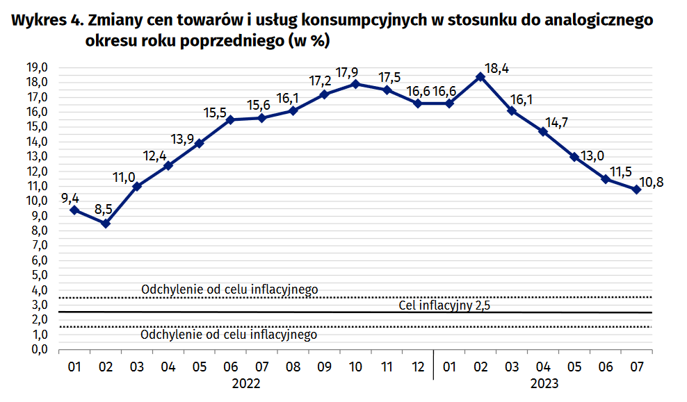 Ceny towarów i usług konsumpcyjnych w lipcu 2023 r. w porównaniu z analogicznym miesiącem ub. roku wzrosły o 10,8% (przy wzroście cen usług – o 11,3% i towarów – o 10,6%). W stosunku do poprzedniego miesiąca ceny