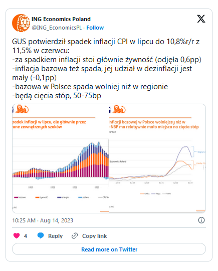 GUS podał wówczas, że najmocniej na wzrost cen oddziałały ceny nośników energii (16,7% rdr), ale w ujęciu miesięcznym ten komponent się nie zmienił. Wzrosły natomiast w stosunku do czerwca ceny paliw do prywatnych środków transportu (o 0,4%), choć w ujęciu rocznym wciąż były niższe o kilkanaście procent (efekt bazy). Żywność i napoje bezalkoholowe lekko potaniały względem czerwca (o 0,2%), ale w porównaniu z lipcem 2022 były średnio droższe o 15,6%.