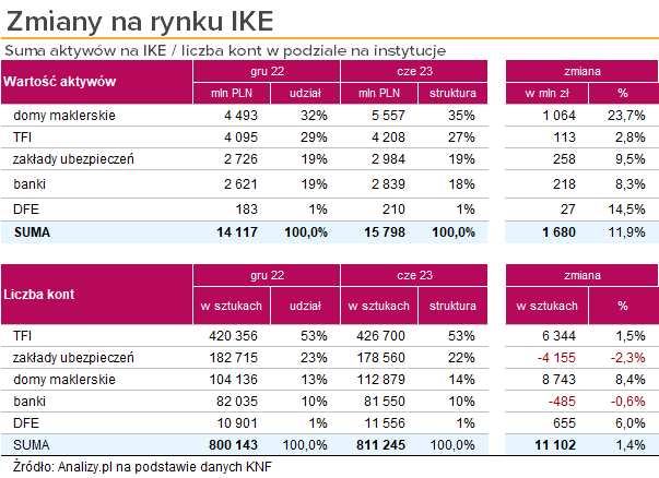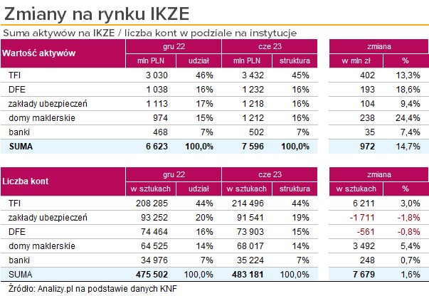 Na drugim miejscu pod względem dynamiki znalazły się IKE prowadzone w formie funduszu DFE przez towarzystwa emerytalne. W pół roku wzrosły o 15% do 210 mln zł (liczba klientów wzrosła o 6% do 11,6 tys.), pozostając najmniejszym graczem na rynku IKE. W najmniejszym stopniu wzrosły aktywa w IKE funduszowych prowadzonych przez TFI - tylko o 3% do 4,2 mld zł. Jednocześnie to właśnie konta funduszowe brylują, jeśli chodzi o ogólną liczbę klientów (426,7 tys. osób).