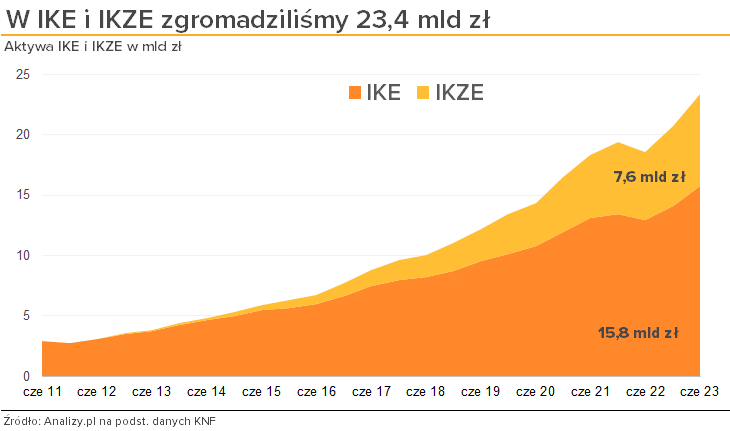 W pół roku wartość aktywów zgromadzonych na IKE wzrosła o 12% do 15,8 mld zł na koniec czerwca, a w IKZE - o 15% do 7,6 mld zł - wynika z najnowszych danych KNF. W największym stopniu aktywa wzrosły na kontach prowadzonych przez domy maklerskie.