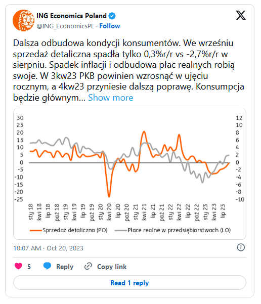 – Dalsza odbudowa kondycji konsumentów. We wrześniu sprzedaż detaliczna spadła tylko 0,3%r/r vs -2,7%r/r w sierpniu. Spadek inflacji i odbudowa płac realnych robią swoje. W 3kw23 PKB powinien wzrosnąć w ujęciu rocznym, a 4kw23 przyniesie dalszą poprawę. Konsumpcja będzie głównym motorem wzrostu w 2024, znów inflacjogenna struktura PKB, dlatego tak ważne uruchomienie KPO i "czekających" FDI – piszą na Twitterze ekonomiści ING.