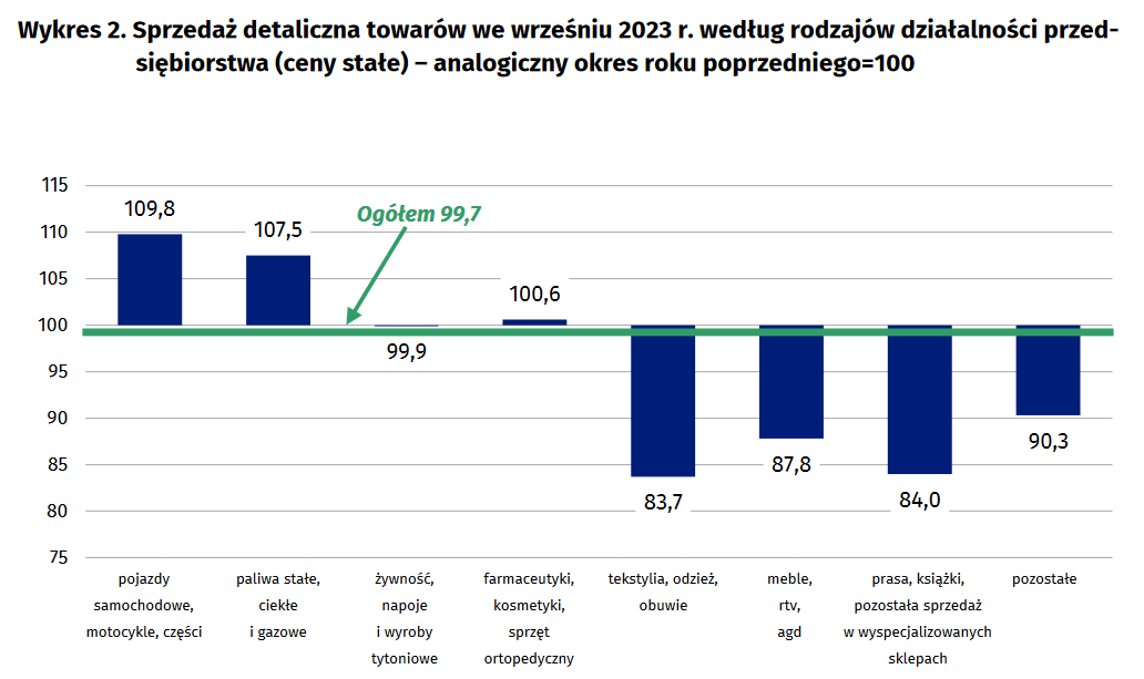 We wrześniu 2023 roku sprzedaż detaliczna w cenach stałych (gdyby nie było inflacji) zmniejszyła się tylko o 0,3% wobec września 2022 roku. W cenach bieżących odnotowano wzrost o 3,6%. To odczyty wyższe od tych z sierpnia oraz od prognoz.
