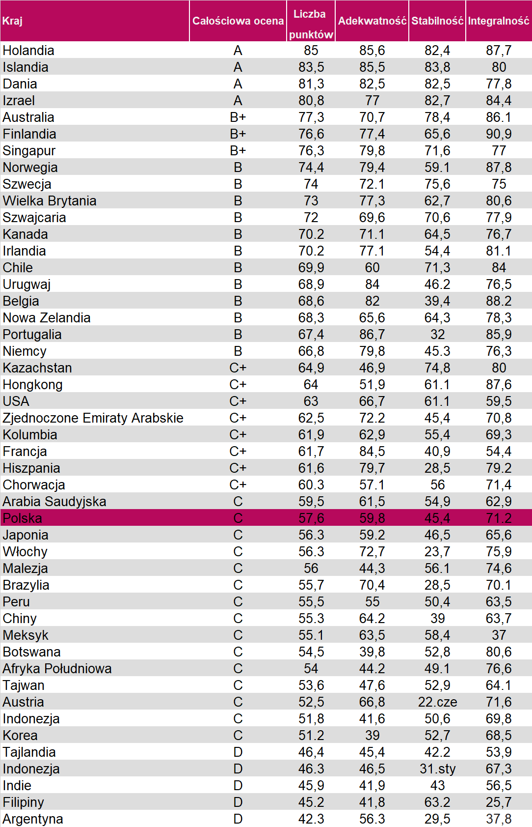 Systemy o najniższych wartościach w poszczególnych subindeksach to: Korea Południowa w zakresie adekwatności (39,0), Austria w zakresie stabilności (22,6) i Filipiny w zakresie integralności (25,7).