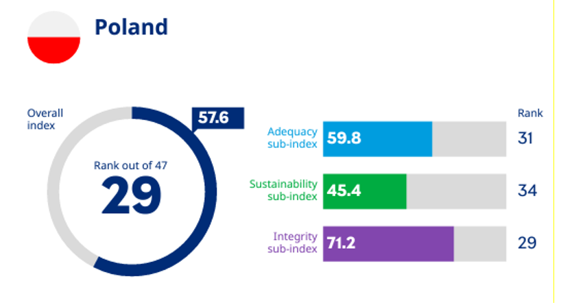 Podobnie jak w czterech poprzednich edycjach badania, także w 2023 roku Polska została zakwalifikowana do piątej kategorii w siedmiostopniowej skali (grupa „C”). Jest to grupa krajów, których systemy emerytalne mają pewne dobre cechy, ale również istotne braki i ryzyka, które powinny być wyeliminowane, bo zagrażają wypłacalności systemu. Aby aspirować do kategorii B, czyli krajów o znacznie lepszych systemach emerytalnych, należałoby uzyskać min. 65 pkt. Przynajmniej 60 pkt wymaga kategoria "C+".