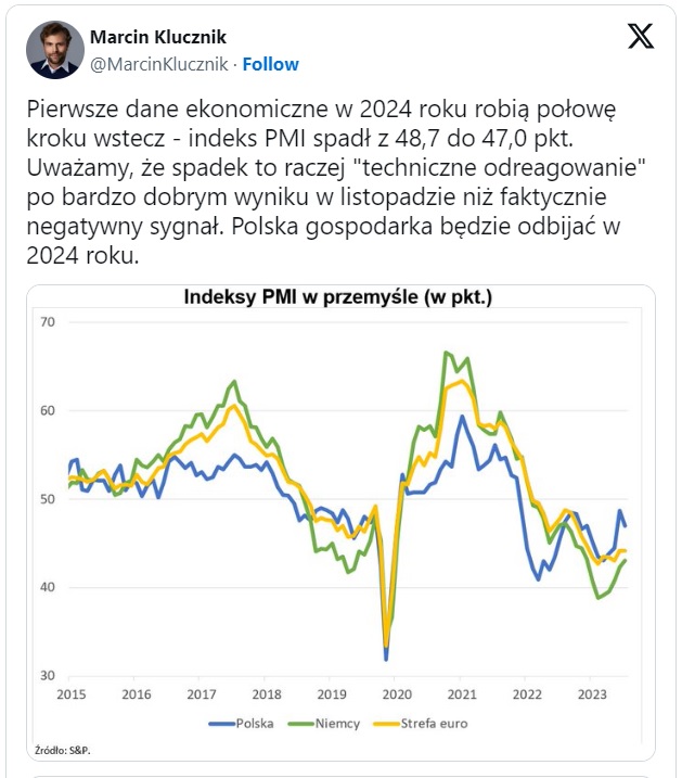 Nowy rok przynosi rozczarowujące wieści z polskiego przemysłu. Indeks PMI spadł w grudniu do 47,4 pkt po imponującym wzroście do 48,7 pkt w listopadzie. Ekonomiści wskazują, że ostatni miesiąc 2023 r. był słaby dla polskiego przetwórstwa, ale w 2024 r. polska gospodarka będzie odbijać.