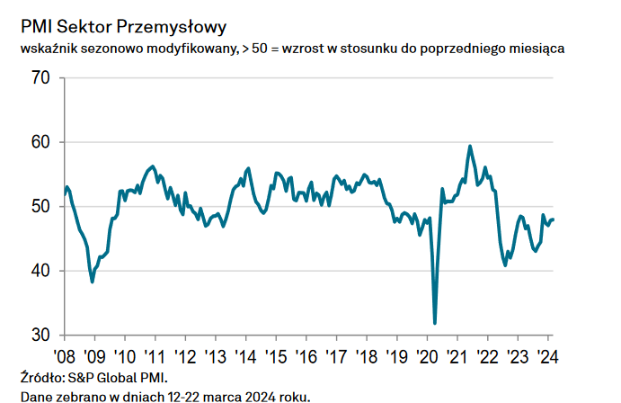 W marcu wskaźnik S&P Global PMI dla sektora przemysłowego w Polsce wyniósł 48,0 pkt i wzrósł nieznacznie w porównaniu do poziomu 47,9 pkt odnotowanego w lutym, osiągając najwyższy poziom od czterech miesięcy. Najnowszy odczyt pozostał jednak nadal poniżej neutralnego progu 50,0 pkt i poniżej prognozy, która wynosiła 48,1 pkt.