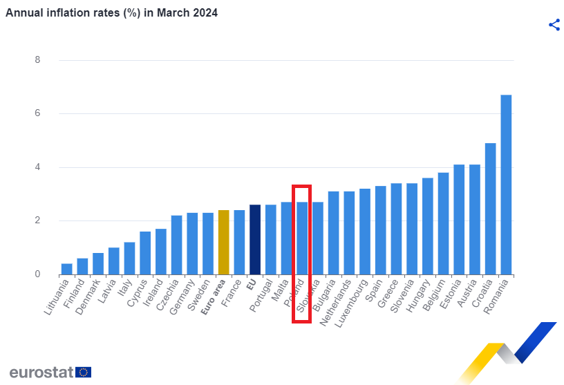 W całej strefie euro stopa inflacji r/r spadła do 2,4%, w porównaniu z 2,6% w lutym. Rok wcześniej wskaźnik ten wynosił 6,9%. Z kolei inflacja w całej Unii Europejskiej wyniosła 2,6% w marcu, w porównaniu z 2,8% w lutym. Rok wcześniej wskaźnik ten wynosił 8,3%.