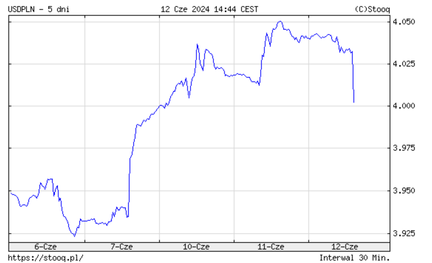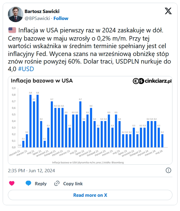 – Inflacja w USA pierwszy raz w 2024 zaskakuje w dół. Ceny bazowe w maju wzrosły o 0,2% m/m. Przy tej wartości wskaźnika w średnim terminie spełniany jest cel inflacyjny Fed. Wycena szans na wrześniową obniżkę stóp znów rośnie powyżej 60%. Dolar traci, USDPLN nurkuje do 4,0 – komentuje Bartosz Sawicki z Cinkciarz.pl.