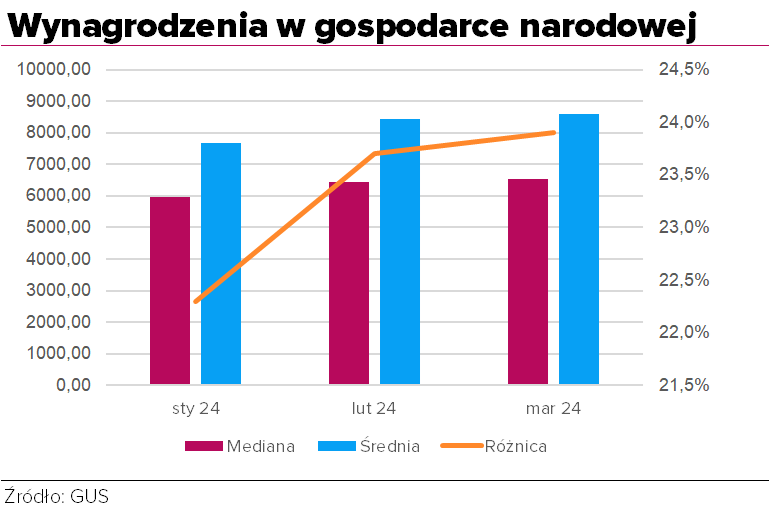 GUS rozpoczął publikowanie co miesiąc przeciętnego miesięcznego wynagrodzenia brutto oraz mediany wynagrodzeń miesięcznych brutto. Pierwsze opublikowane dane dotyczą stycznia, lutego i marca 2024 r. Dane za kolejne miesiące publikowane będą z częstotliwością miesięczną od października 2024 r.