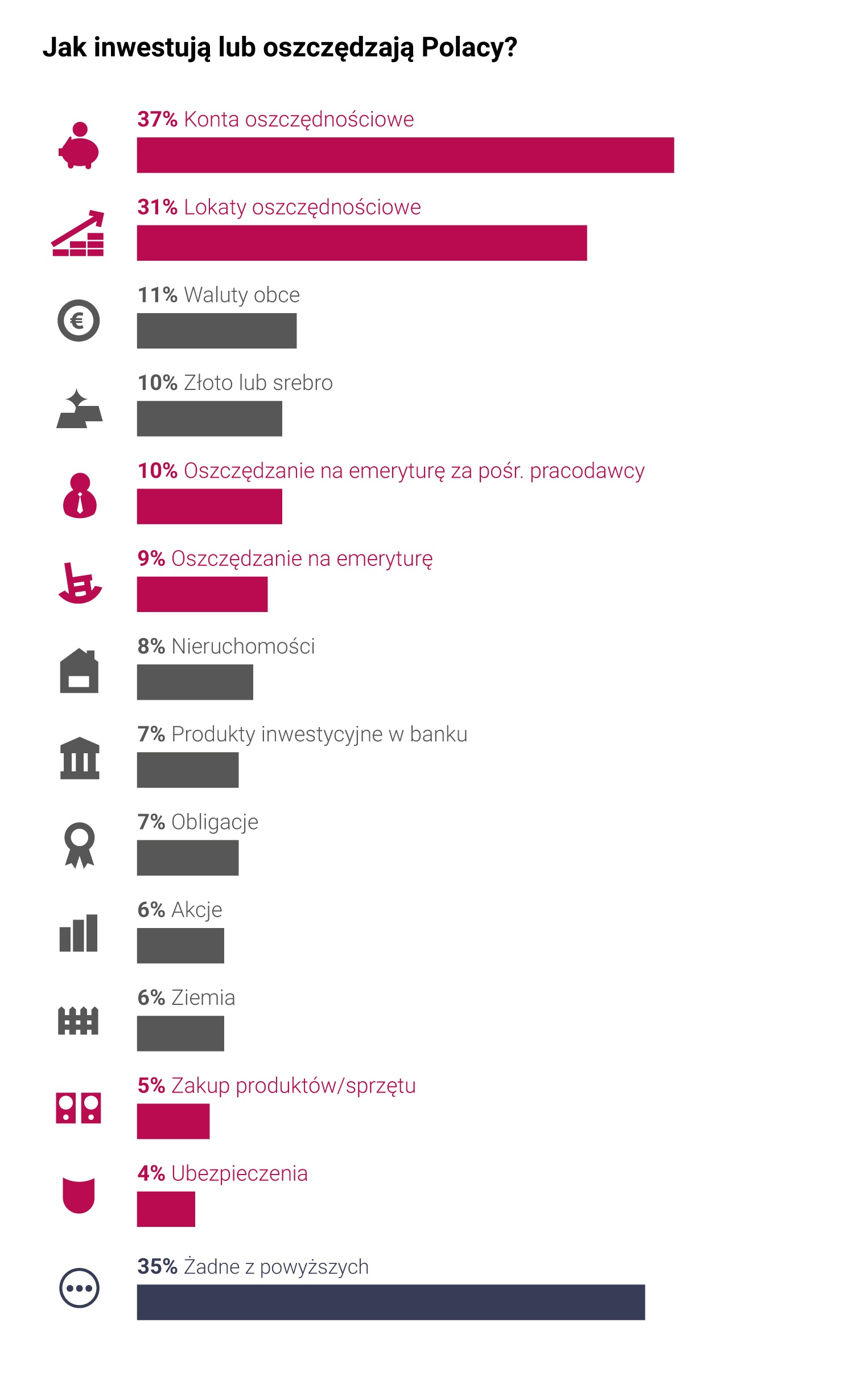 Respondenci zostali także zapytani o to, w co inwestują pieniądze. Najczęściej wskazywali: waluty obce (11% badanych), złoto lub srebro (10% badanych) i nieruchomości (8% badanych). Sięgają także po produkty inwestycyjne w banku (7% badanych), obligacje (7% badanych), akcje (6% badanych) lub kupują ziemię (6%. badanych).