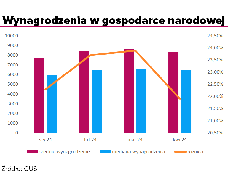 W kwietniu 2024 r. mediana wynagrodzeń miesięcznych brutto w gospodarce narodowej była niższa o 21,9% od przeciętnego miesięcznego wynagrodzenia brutto.