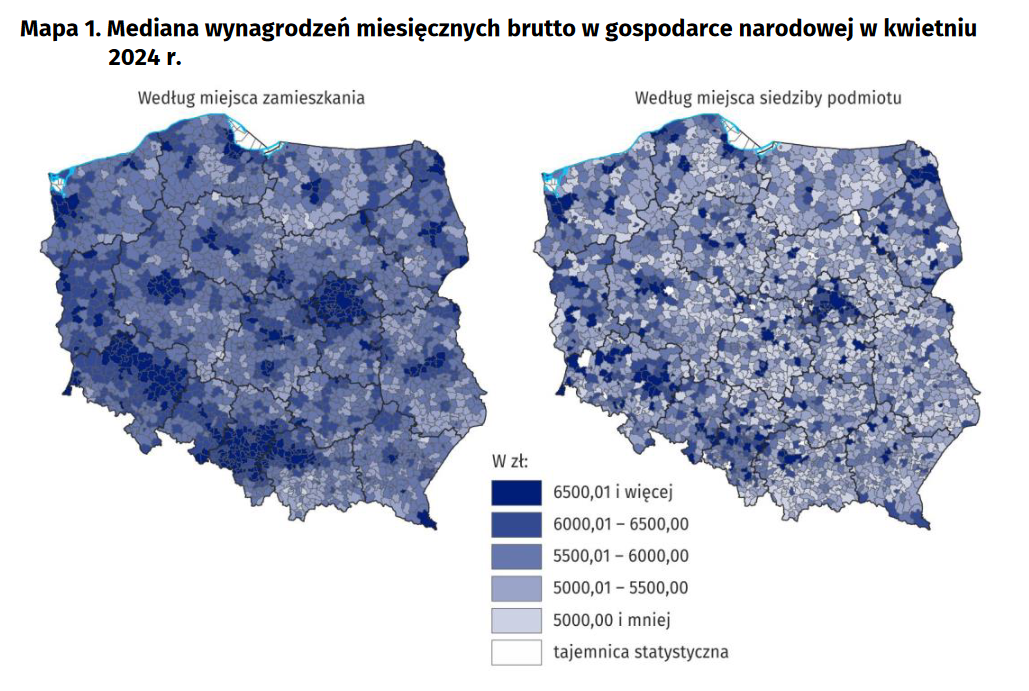 Wynagrodzenia w gospodarce narodowej w kwietniu 2024 r. były zróżnicowane terytorialnie ze względu na miejsce zamieszkania zatrudnionych, jak i według miejsca siedziby podmiotu.