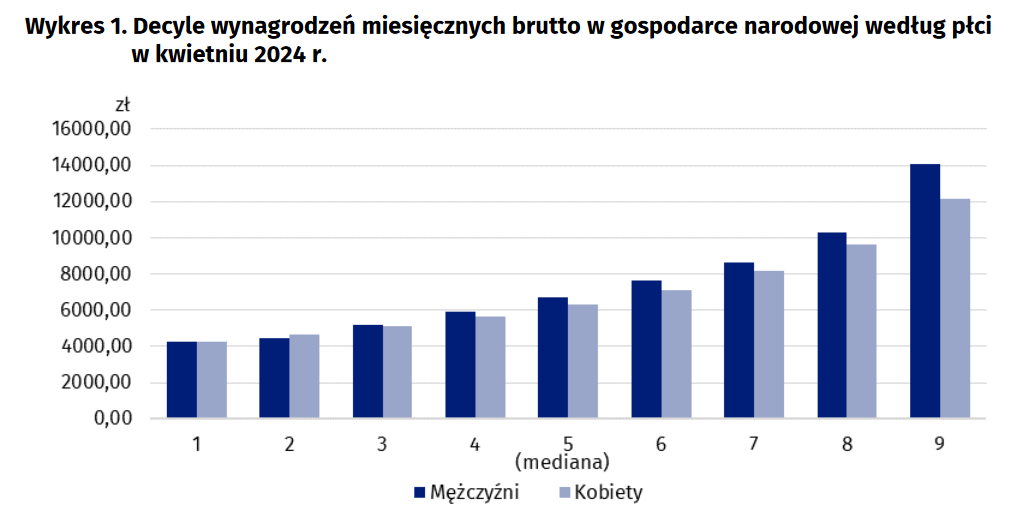 W 8 z 9 omawianych przedziałach wynagrodzeń występowały różnice ze względu na płeć zatrudnionych – jedynie w decylu pierwszym wartość wynagrodzeń kobiet i mężczyzn kształtowała się na tym samym poziomie. Największa różnica w wynagrodzeniach według płci wystąpiła w decylu dziewiątym i wyniosła 1908,20 zł.