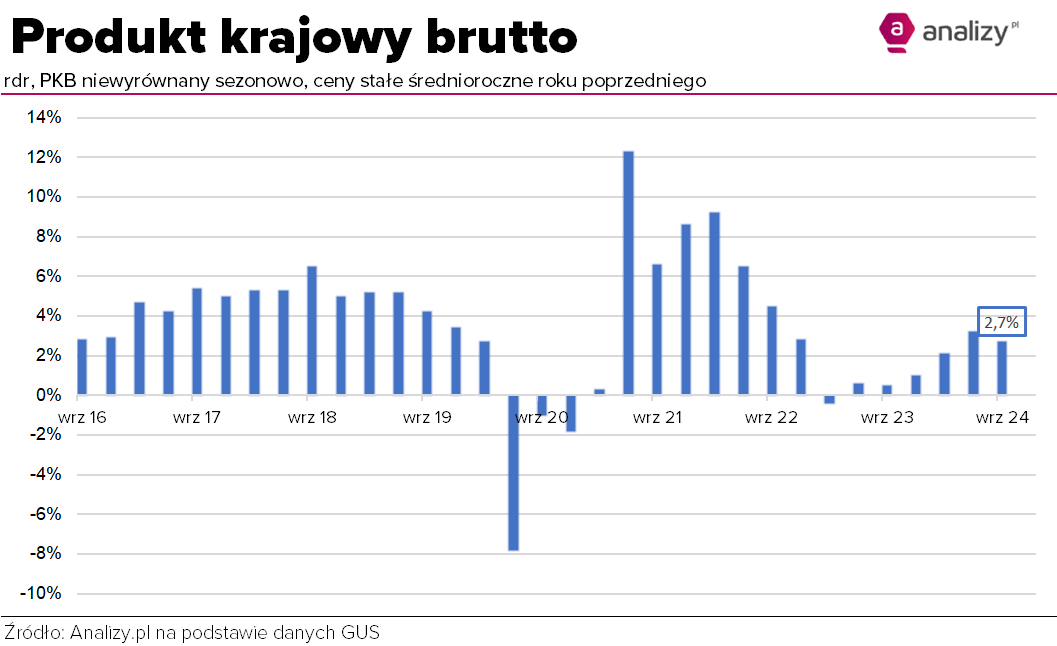 Według szybkiego szacunku Głównego Urzędu Statystycznego produkt krajowy brutto (PKB) niewyrównany sezonowo w III kwartale 2024 r. zwiększył realnie się o 2,7% rok do roku wobec wzrostu o 0,5% w analogicznym okresie 2023 r. Ekonomiści oczekiwali takiego właśnie odczytu, ale oczekiwania zostały skorygowane w dół. Wcześniej konsensus wynosił 2,9% (prognozy za macronext.pl).