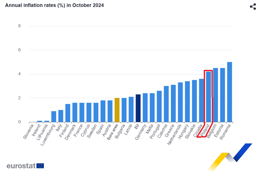 Z kolei w całej Unii Europejskiej inflacja wyniosła 2,3% w październiku 2024 r. w porównaniu z 2,1% we wrześniu. Rok wcześniej wynosiła 3,6%. Dane te podał Eurostat, urząd statystyczny Unii Europejskiej.