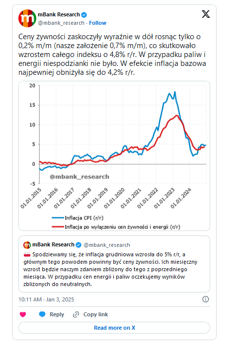 – Ceny żywności zaskoczyły wyraźnie w dół, rosnąc tylko o 0,2% m/m (nasze założenie 0,7% m/m), co skutkowało wzrostem całego indeksu o 4,8% r/r. W przypadku paliw i energii niespodzianki nie było. W efekcie inflacja bazowa najpewniej obniżyła się do 4,2% r/r – skomentowali na platformie X ekonomiści mBanku.