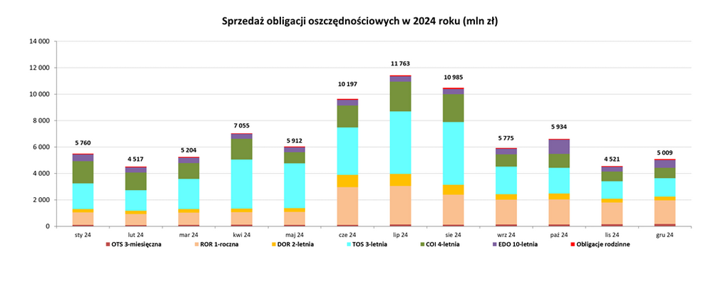 Zaintersowanie obligacjami oszczędnościowymi przełożyło się na zakupy tych papierów w 2024 roku o rekordowej wartości ponad 82,6 mld zł. Średnio każdego miesiąca 2024 roku Polacy lokowali w oszczędnościowych obligacjach skarbowych 6,9 mld zł, czyli o 70% więcej niż w 2023 roku.