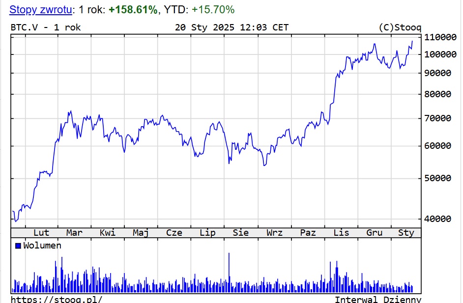 W dniu inauguracji Donalda Trumpa na 47. prezydenta Stanów Zjednoczonych, rynek kryptowalut ponownie znalazł się w euforii. Bitcoin osiągnął rekordową wartość, przekraczając rano poziom 109 tys. USD. Jedynie w tym roku ta najpopularniejsza kryptowaluta podrożała o ponad 16 proc.