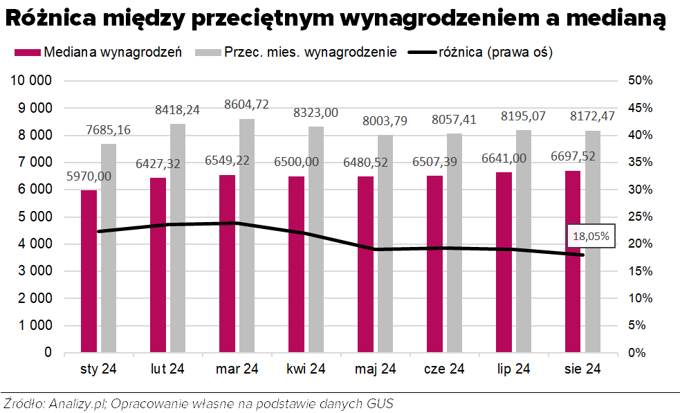 W sierpniu 2024 r. mediana wynagrodzeń miesięcznych brutto w gospodarce narodowej była niższa o 18,0% od przeciętnego miesięcznego wynagrodzenia brutto. To o punkt procentowy mniej niż miesiąc wcześniej.