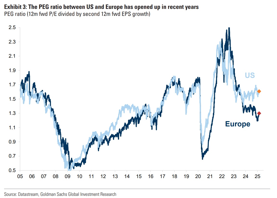 Jak zauważają eksperci Goldmana, lata przewagi amerykańskiego rynku doprowadziły do wzrostu wycen w porównaniu z innymi rynkami, jednak premia ta była uzasadniona silniejszym wzrostem - wskaźnik PEG dla USA pozostawał bowiem zgodny z resztą świata. W ostatnim czasie jednak rosnący optymizm wobec przyszłości amerykańskiego rynku oraz narastający pesymizm wobec innych regionów zaczęły pogłębiać tę różnicę. Szczególnie widoczne było to w Europie.