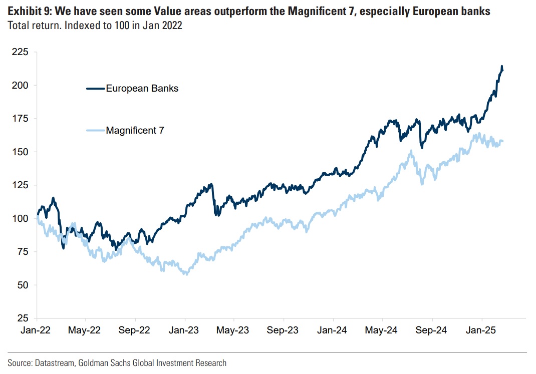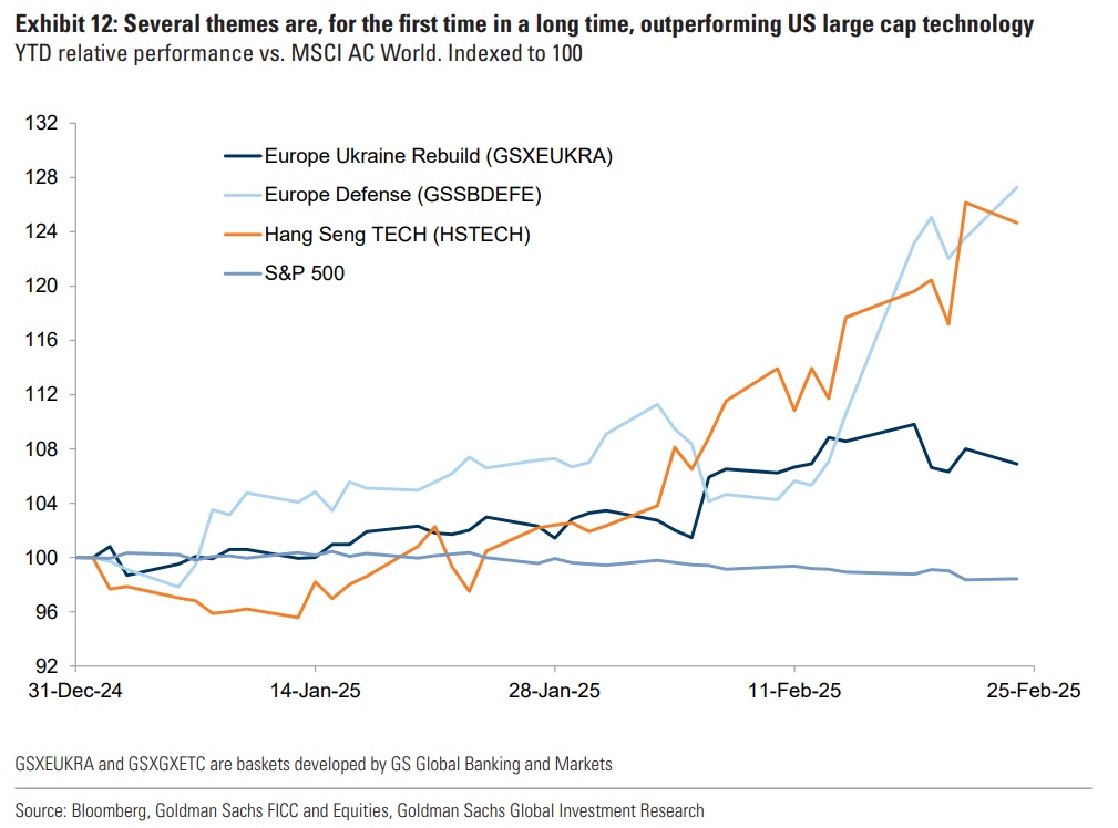 - To zjawisko widoczne jest zarówno geograficznie, jak i w podziale na sektory oraz kluczowe tematy inwestycyjne - wskazują eksperci Goldmana. - Po pierwsze, zwroty na indeksie S&P 500 stają się bardziej zróżnicowane – indeks ważony równomiernie osiąga lepsze wyniki niż indeks ważony kapitalizacją rynkową. Podczas gdy grupa Magnificent 7 od początku roku spadła o 2 proc., pozostałe 493 spółki wzrosły o 4 proc. Po drugie, amerykański rynek akcji ustępuje innym rynkom, szczególnie Europie, gdzie indeksy wzrosły o 10 proc. w ujęciu dolarowym od początku roku, w porównaniu do zaledwie 2 proc. wzrostu dla S&P 500. Po trzecie, po raz pierwszy od dłuższego czasu kilka kluczowych trendów przewyższa wyniki amerykańskich gigantów technologicznych. Premiera modelu DeepSeek ponownie rozbudziła zainteresowanie chińskim sektorem technologicznym, który wzrósł już o ponad 35 proc. od styczniowego dołka. Tymczasem wydarzenia wokół Ukrainy przyczyniają się do gwałtownego wzrostu europejskich firm technologicznych oraz spółek zaangażowanych w potencjalną odbudowę kraju - zauważają.