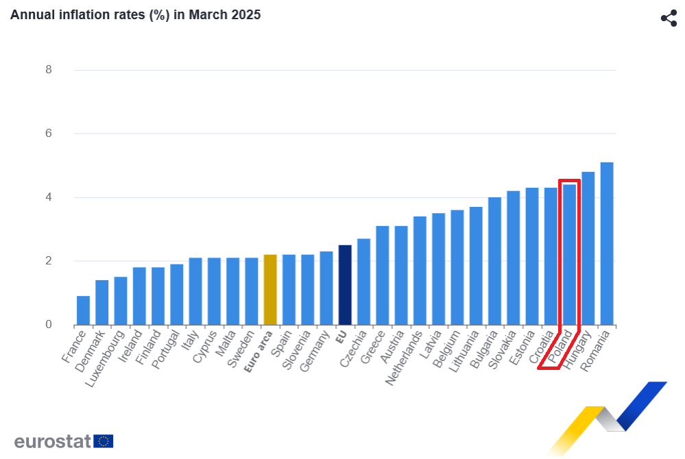 Najwyższa inflacja była natomiast w Rumunii (5,1%), na Węgrzech (4,8%) i w Polsce (4,4%).