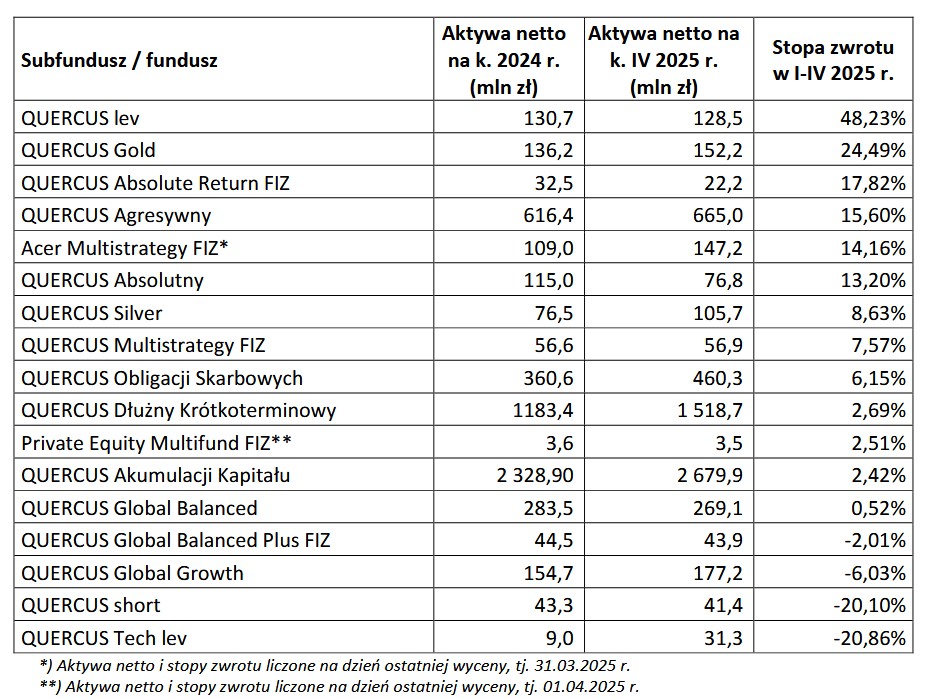 Aktywa Quercus TFI pod zarządzaniem na koniec kwietnia 2025 r. wyniosły 7,19 mld zł