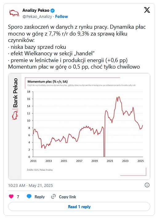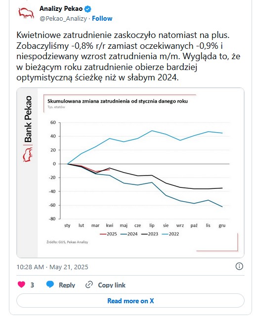 – Kwietniowe zatrudnienie zaskoczyło natomiast na plus. Zobaczyliśmy -0,8% r/r zamiast oczekiwanych -0,9% i niespodziewany wzrost zatrudnienia m/m. Wygląda to, że w bieżącym roku zatrudnienie obierze bardziej optymistyczną ścieżkę niż w słabym 2024 – zauważają eksperci z Pekao.