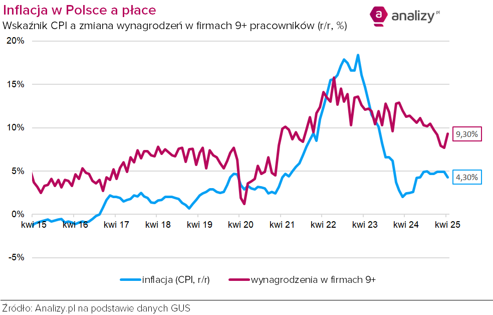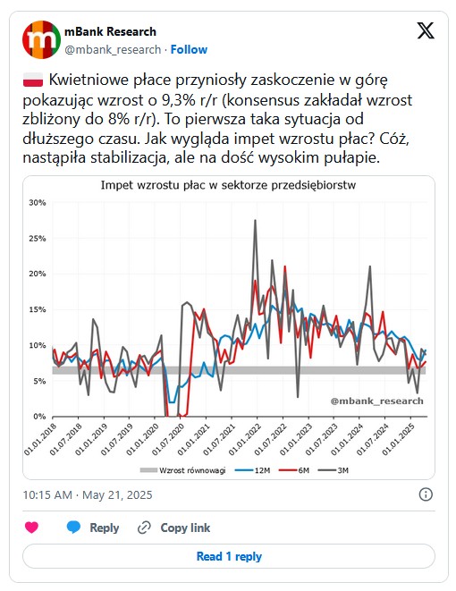– Kwietniowe płace przyniosły zaskoczenie w górę, pokazując wzrost o 9,3% r/r (konsensus zakładał wzrost zbliżony do 8% r/r). To pierwsza taka sytuacja od dłuższego czasu. Jak wygląda impet wzrostu płac? Cóż, nastąpiła stabilizacja, ale na dość wysokim pułapie – komentują ekonomiści mBanku.