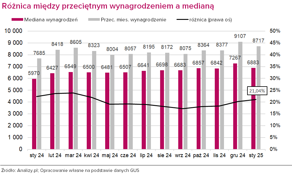 Ponad 1,8 tys. zł – tyle wynosiła różnica między średnim wynagrodzeniem a medianą płac brutto w gospodarce narodowej w styczniu 2025 r. - wynika z danych GUS.