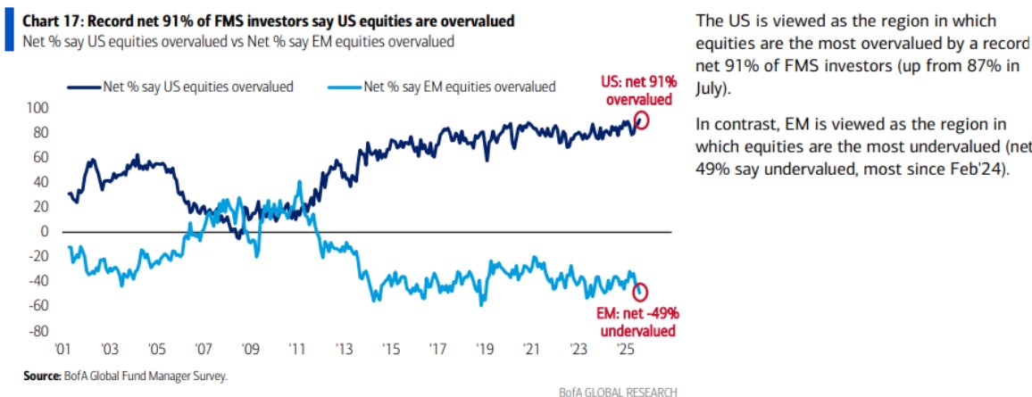 Jednocześnie jednak aż 91% ankietowanych uważa, że amerykańskie akcje są przewartościowane. Badanie Bank of America pokazało też, że choć alokacja globalnych akcji w portfelach jest najwyższa od lutego, to w przypadku akcji notowanych w USA niedoważenie netto sięga 16%. Również od lutego najwięcej zarządzających (49%) uważa, że akcje spółek z rynków wschodzących są niedowartościowane.
