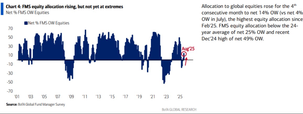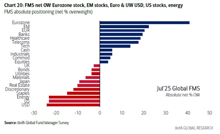 Według miesięcznego badania BofA wśród zarządzających funduszami kupowanie akcji dużych amerykańskich spółek technologicznych ponownie stało się najpopularniejszą transakcją, a to dzięki bardzo dobrym wynikom spółek za II kwartał 2025 roku oraz poprawie nastrojów odnośnie do globalnej gospodarki, co skłania inwestorów do powrotu do akcji.