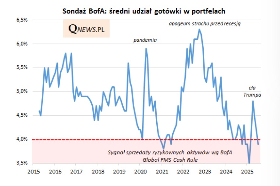– W najnowszym, lipcowym sondażu Bank of America wśród zarządzających funduszami uwagę przykuwa w pierwszej kolejności sygnał sprzedaży ryzykownych aktywów wygenerowany przez tzw. regułę gotówką (BofA FMS Cash Rule) – zwraca uwagę Tomasz Hońdo z Quercus TFI.– Chodzi o to, że średni poziom gotówki w portfelach deklarowany przez ankietowanych menedżerów spadł poniżej progu 4%, co wg wspomnianej reguły świadczyć może o nadmiernym rynkowym apetycie na ryzyko. Dla porównania jeszcze w kwietniu, po szoku wywołanym przez cła Trumpa, udział gotówki w portfelach podskoczył do 4,8%, co było wartością najwyższą od 15 miesięcy.