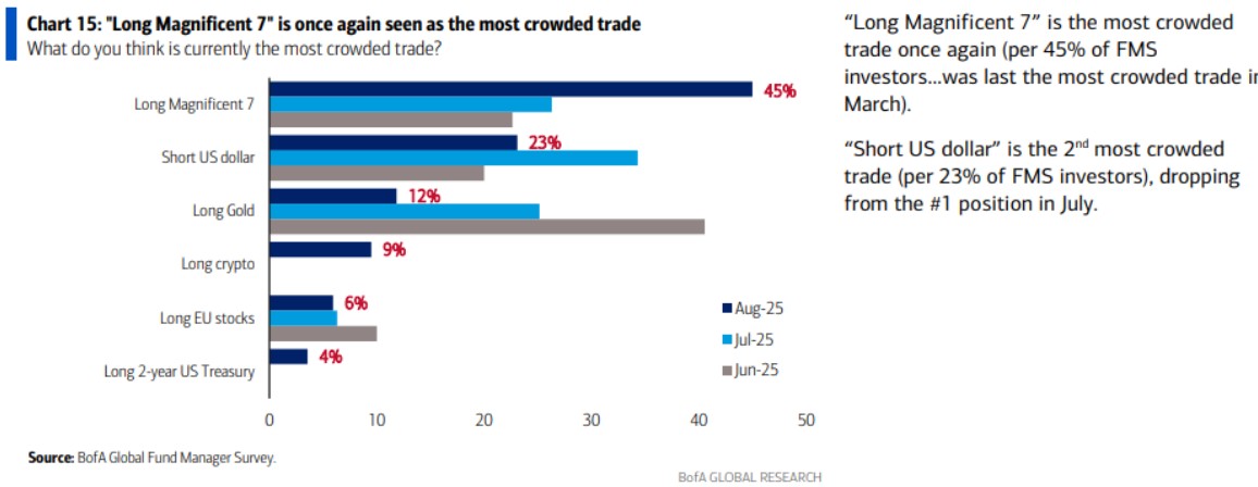 Z deklaracji 45% ze 169 uczestników sierpniowego badania, którzy zarządzają aktywami o wartości 413 miliardów dolarów, wynikło, że najbardziej obleganą transakcją była „długa pozycja Magnificent 7”, grupa dużych amerykańskich akcji technologicznych, w tym Nvidii i Microsoftu. 23% wskazało krótkie pozycje na dolarze, a długie na złocie – 12%.