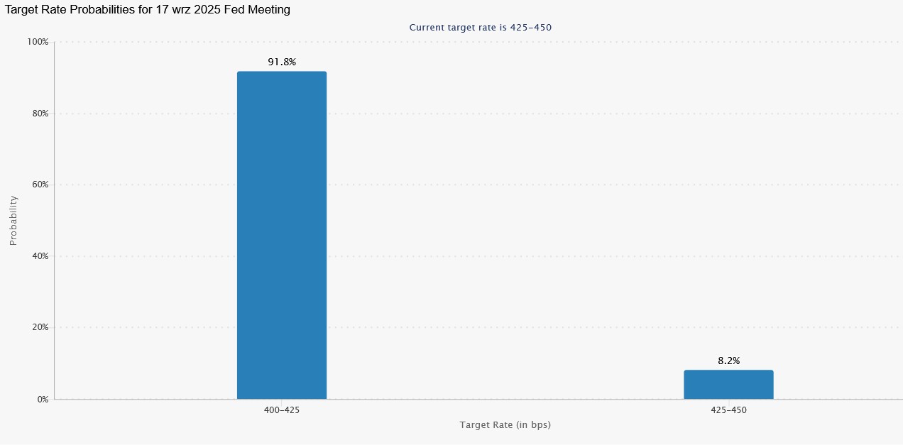 Rzeczywiście wg FedWatch CME prawdopodobieństwo obniżki stóp o 25 punktów bazowych we wrześniu (decyzja 17) wzrosło do 91,8% z 85,9% 11 sierpnia.