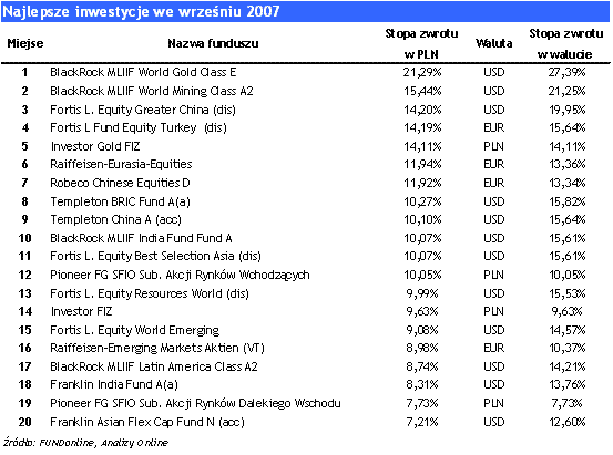 We wrześniu 2007, najwięcej zyskali inwestorzy, którzy posiadali jednostki uczestnictwa akcyjnych funduszy sektorowych inwestujących w spółki surowcowe. Liderem rankingu TOP 20, który uwzględnia polskie i zagraniczne fundusze inwestycyjne, ale także odzwierciedla zmiany walutowe, jakie zaszły w ostatnim miesiącu, jest fundusz BlackRock Word Gold. Słabnący dolar wpłynął na wzrost ceny złota, co przyczyniło się do wzrostu wycen spółek zajmujących się jego obróbką i wydobyciem. Złoto jest odwrotnie skorelowane z kursem dolara, zatem, podczas gdy dolar tanieje cena złota wzrasta. Równie dobrze wypadł fundusz BlackRock Word Mining inwestujący w spółki zajmujące się wydobyciem ropy, miedzi oraz innych surowców. Podobnie jak w przypadku funduszu BlackRock Word Gold, głównym powodem tak silnego wzrostu wycen jednostek tego funduszu była rosnąca cena ropy oraz spadek ceny dolara. Trzecią pozycję w rankingu zajął fundusz Fortis Greater China, który skorzystał z koniunktury królującej we wrześniu na większości rynków wschodzących. Ponieważ fundusz ten inwestuje nie tylko w Chinach, ale także na Tajwanie i w Hong Kongu, to wypracowana przez niego stopa zwrotu była w grupie funduszy typu Emerging Markets najwyższa. Czwarty wyniki osiągnął fundusz Fortis Equity Turkey dedykowany rynkowi tureckiemu. Piątą pozycję zajął fundusz Investor Gold FIZ, który z podobnych powodów jak fundusz BlackRock Word Gold osiągnął bardzo dobry wynik. We wrześniu dolar osłabił się względem złotówki o 4,79%, a euro o -1,26%.