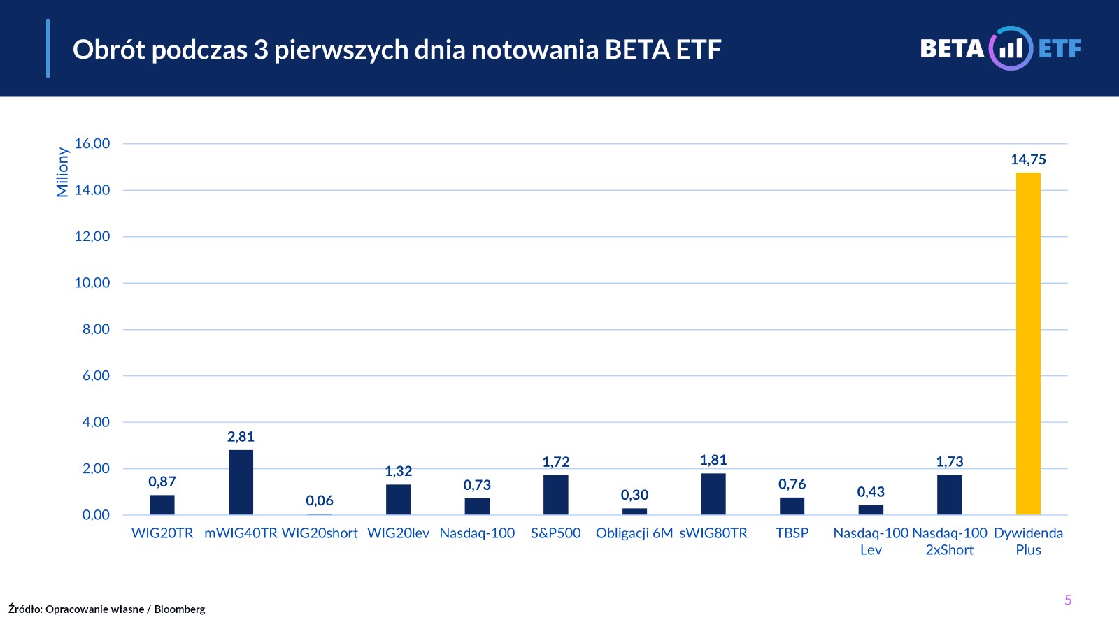Przypomnijmy, że w poniedziałek, 18 sierpnia, na GPW zadebiutował Beta ETF Dywidenda Plus Portfelowy FIZ (Dis) (PLN) (ETFBDIVPL). Debiut wywołał duże poruszenie w społeczności inwestorów. Zarówno na portalach branżowych, blogach, jak i w mediach społecznościowych pojawiło się wiele komentarzy, pytań i opinii na temat nowego funduszu. W pierwszych trzech dniach notowań obroty sięgnęły łącznie niemal 15 mln zł, co się przełożyło na ponad 4,2 tys. transakcji.