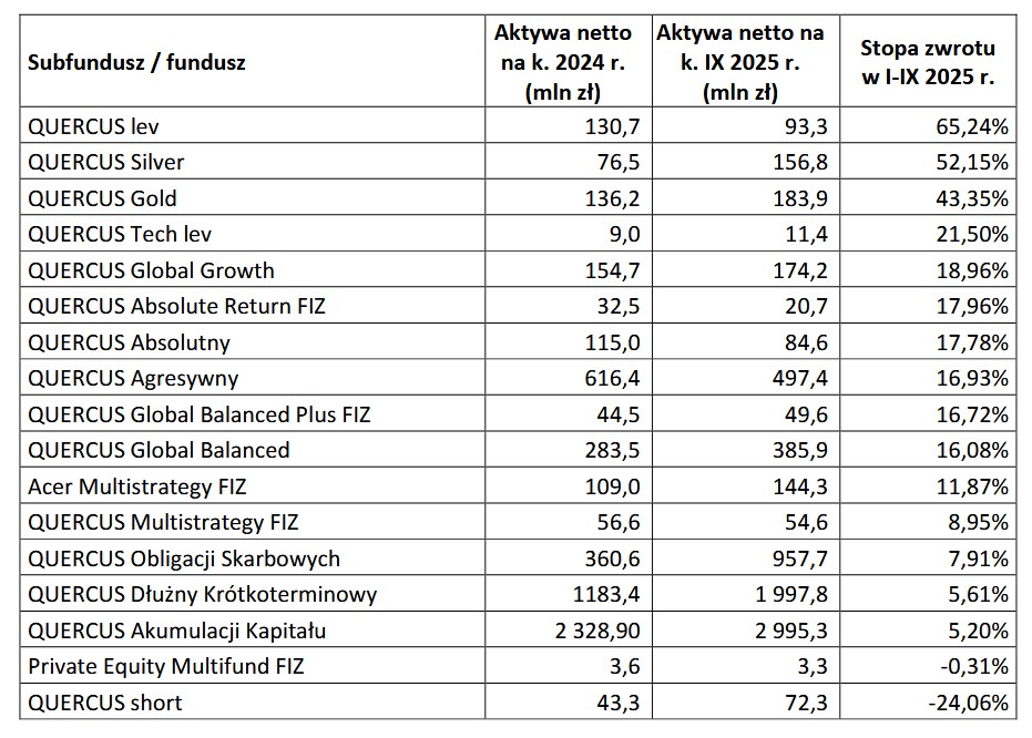 Na wartość aktywów pod zarządzaniem Quercus TFI na koniec września 2025 r. składało się: