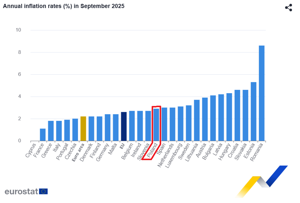 Roczna inflacja w całej Unii Europejskiej wyniosła natomiast we wrześniu 2025 r. 2,6% w porównaniu z 2,4% w sierpniu. Rok wcześniej stopa ta wynosiła 2,1%.
