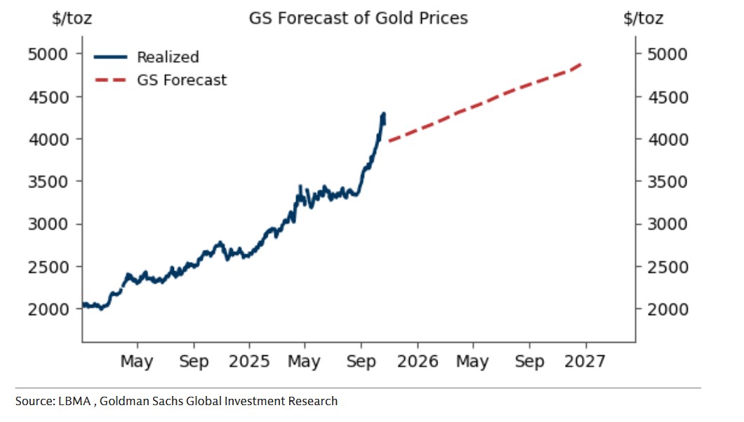 Analitycy Goldman Sachs oczekują, że długoterminowe zakupy strukturalne będą kontynuowane. Bank utrzymuje prognozę ceny złota na poziomie 4 900 dol./toz na koniec 2026 r., widząc nawet potencjał wzrostu powyżej tego poziomu.
