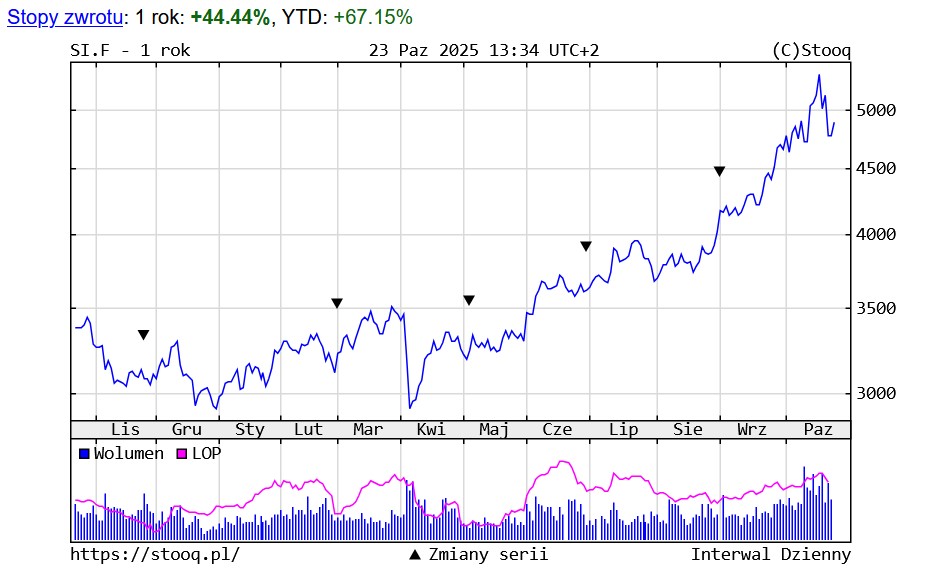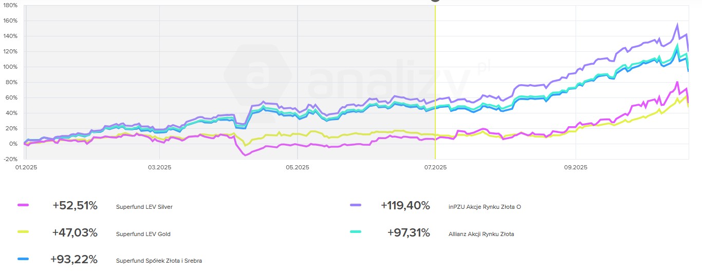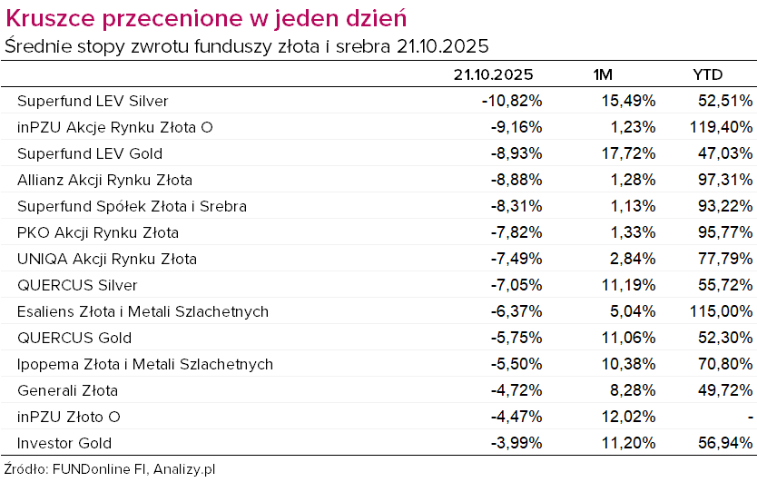 Wśród funduszy otwartych fundusze metali szlachetnych spadały najmocniej ze wszystkich kategorii. Straciły one tego dnia od 4% do nawet 11% (lewarowany fundusz srebra). W tabeli poniżej widać wyniki z wtorku w zestawieniu ze stopą zwrotu za miesiąc oraz od początku 2025 roku.