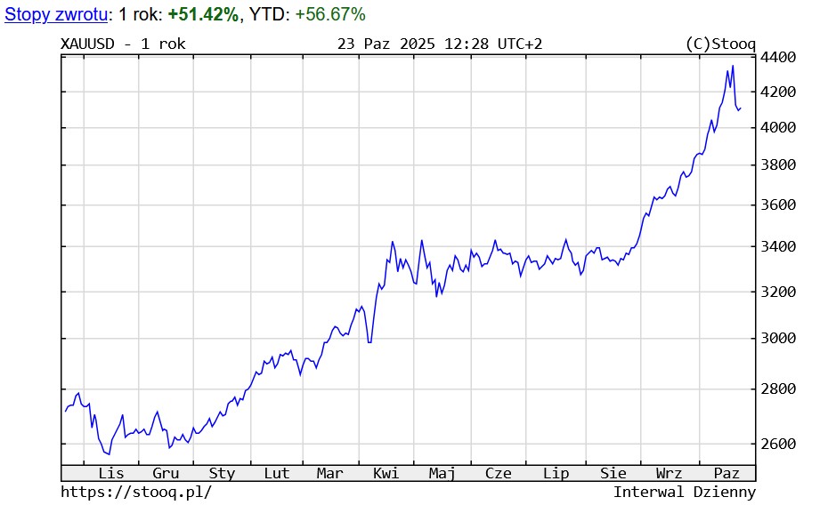 Cena złota wzrosła o 26% od września, o 57% od początku 2025 roku i ponaddwukrotnie od 2023 roku, osiągając rekordowy poziom 4 378 dolarów za uncję trojańską, po czym we wtorek 21 października w ciągu jednego dnia spadła o 6% do 4 100 dolarów.