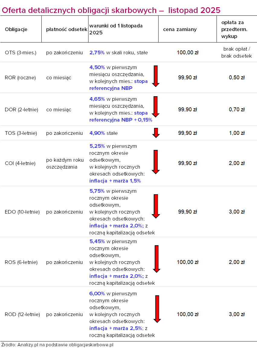 Kupon obligacji 1-rocznych o zmiennym oprocentowaniu opartym o stopę referencyjną NBP wyniesie w listopadzie 4,50%, a 2-letnich (także bazujących na stopie referencyjnej NBP) – 4,65% w pierwszym miesięcznym okresie odsetkowym.