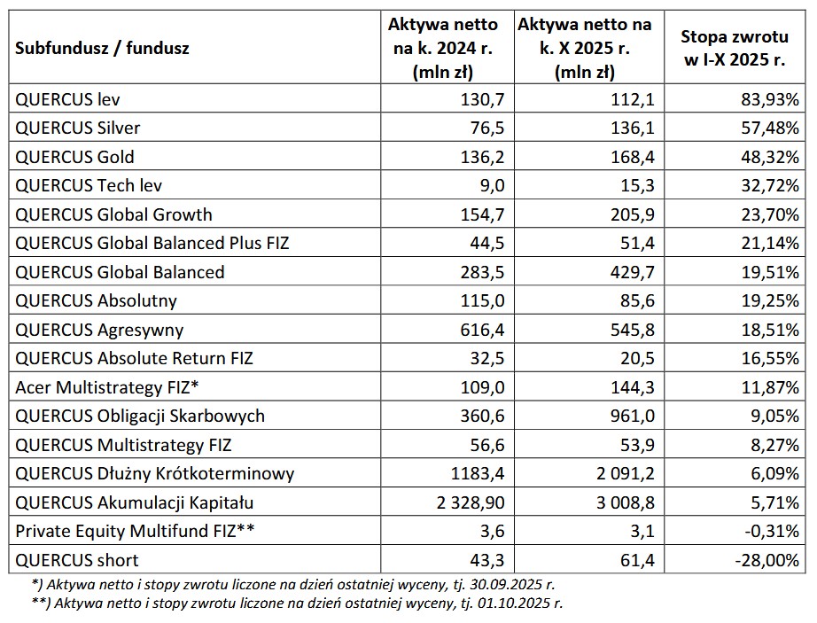 Aktywa Quercus TFI pod zarządzaniem na koniec października 2025 r. wyniosły 8,82 mld zł